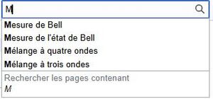 La recherche porte sur les titres (concepts, y compris leurs autres formes lexicales) en priorité. L’autocomplétion permet de trouver plus rapidement des pages par le nom exact (insensible à la casse) et dans l'ordre alphabétique. Dans ce cas, cliquer sur le nom envoie directement sur ladite page.