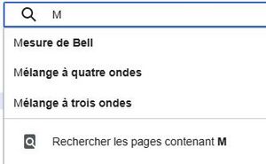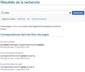 Il est possible de trouver une page grâce à son titre (nom du concept) ou un synonyme répertorié. Les synonymes ne sont présents dans la barre de recherche qu'avec l'affichage Vector (pour plus d'informations, voir Aide:Compte).
